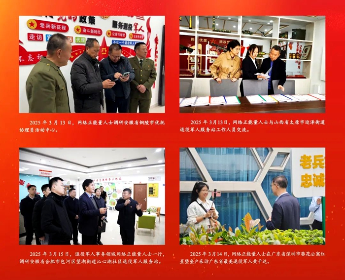 网络正能量人士围绕“网聚崇军正能量”话题,在社交媒体、视频网站等平台,通过图文、海报、短视频、现场直播等形式,将所见所感所悟,转化为鲜活立体的正能量作品,展现新时代退役军人工作的显著成效,讲述新时代退役军人的感人故事,描绘新征程上退役军人的奋斗底色。